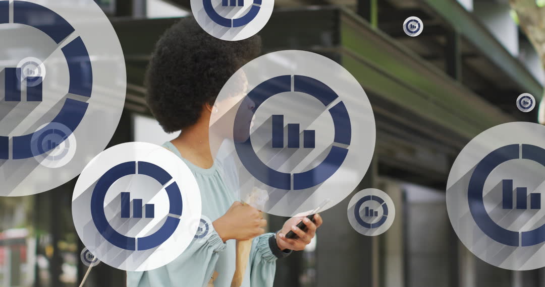 Animation depicts a woman blending urban lifestyle with modern business concepts. Graph icons overlay while she scrolls on smartphone in a city setting. Perfect for marketing campaigns focusing on technology, data analysis, business insights, and modern living. Suitable for illustrating multitasking in an interconnected world.