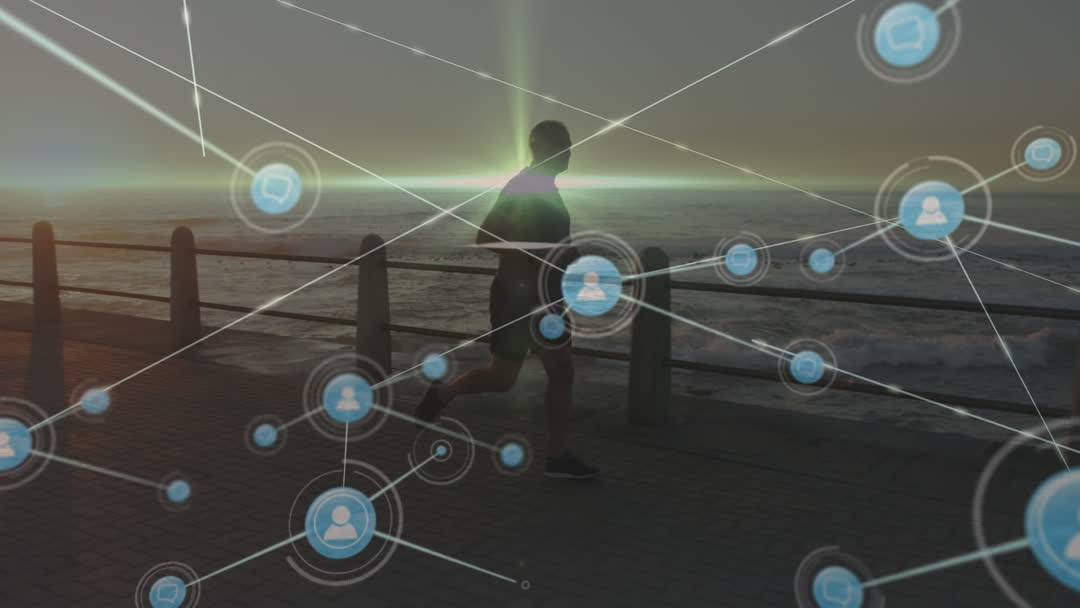 This visual represents the intersection of fitness and digital technology as a silhouette of a man runs along a seaside promenade. Designed to illustrate how modern technology keeps individuals connected through virtual networks, it is ideal for use in articles or blogs focusing on health, sports technology, innovative fitness apps, or digital lifestyles.