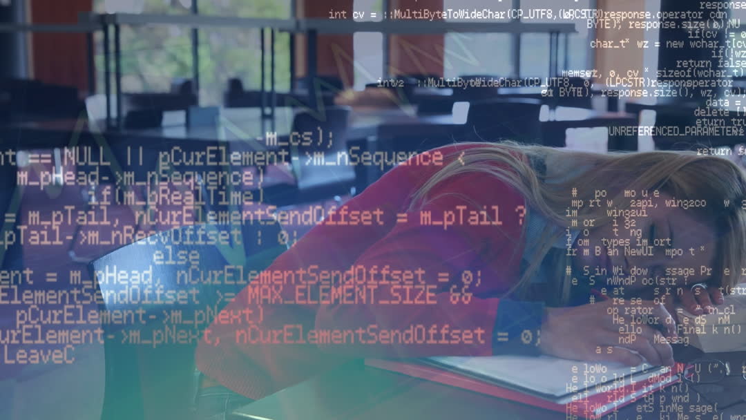 Incorporating modern technology themes, the video portrays the strain of workload on individuals today. The transparent overlay of codes suggests digital stress and the complex interplay within high-pressure environments. Useful in contexts discussing work-life balance, digital society, or cyber education.