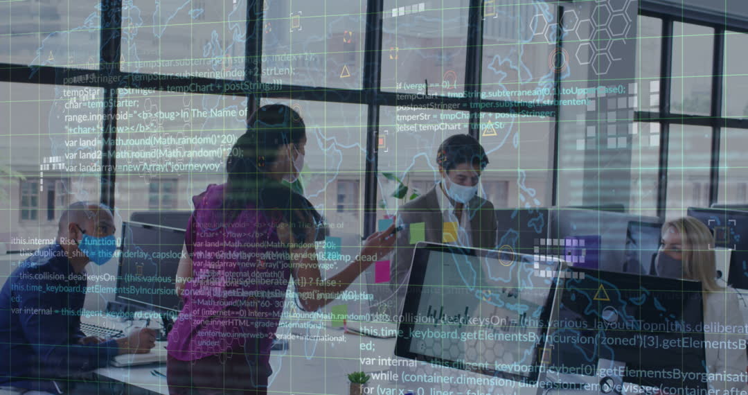Diverse business team collaborating on a project in modern office setting, with overlaid data processing elements emphasizing digital innovation. Ideal for visualizing high-tech, collaborative work environments. Useful for illustrating concepts related to teamwork, digital transformation, and modern workspace trends.