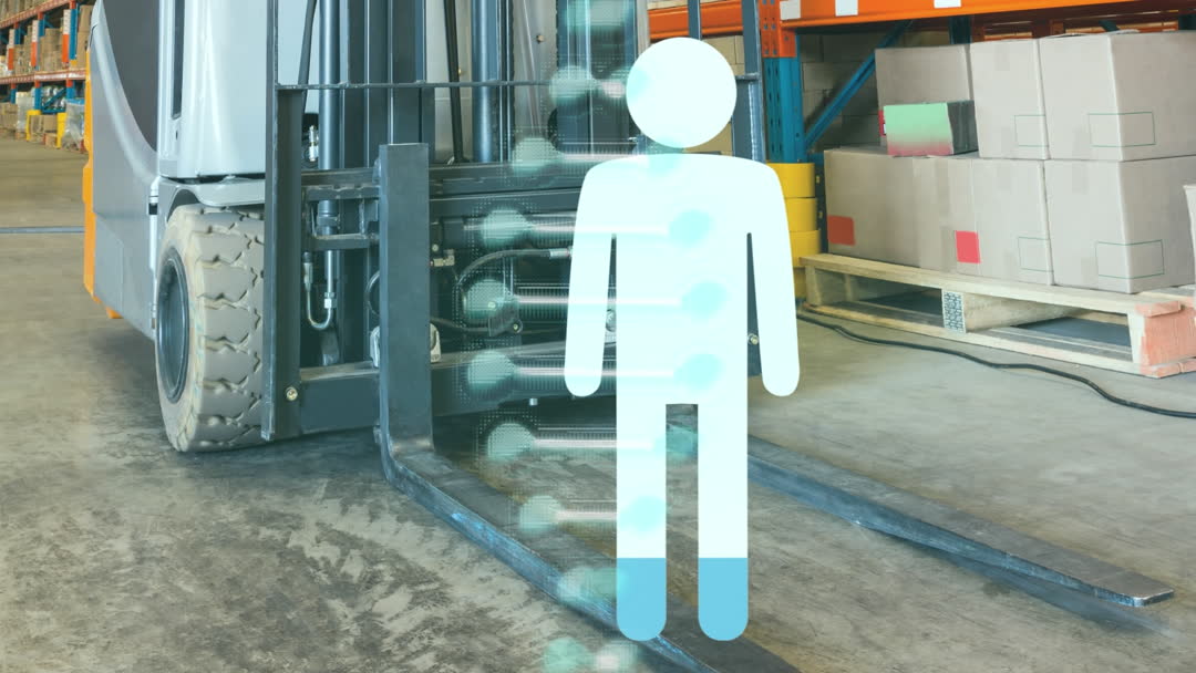 Animation showing human and DNA graphics overlaying a warehouse with forklifts and boxes suggests integration of technology in logistics. Useful for themes of digital transformation in business, safety practices in supply chains, and advancement of warehouse management systems. Suitable for illustrating articles or presentations about technological advancements and automation in warehouses.