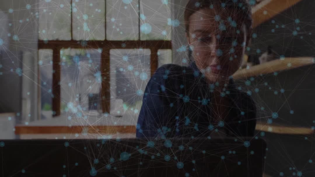 Image visualizing the concept of digital connectivity in a professional office setting. Features woman working on laptop with overlay of network nodes symbolizing technology integration. Suitable for branding related to modern workspaces, technological trends, internet networks, or business presentations.