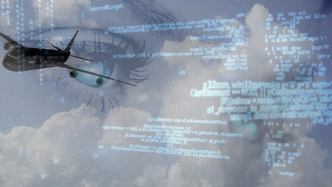 Concept of integration between aviation, technology, and human perception. Illustrates a blend of digital data and air travel elements, portraying innovation in logistics and technology-driven travel. Useful in presentations on data-driven transportation solutions and emerging tech trends in aviation.