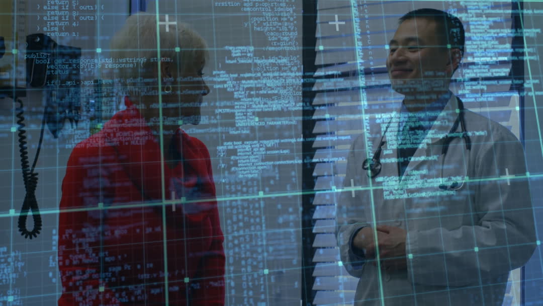 Doctor engaging in conversation with senior patient represents how technology is integrating into healthcare consultations. The overlay of digital data suggests themes of medical innovation and digital transformation in the healthcare industry, highlighting modern medical practices. Useful for themes related to digital healthcare, patient care advancements, and technological solutions in medicine.