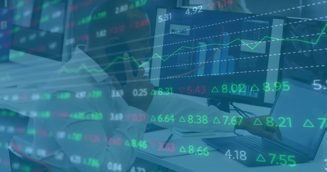 Image showcases a modern financial setting where an African American businessman is engaged on the phone while working on a laptop. Overlay of fluctuating stock market data symbolizes concept of digital advancement and its impact on financial analysis. Ideal for illustrating themes around business technology, investment strategies, office environments, and digital communication in finance.