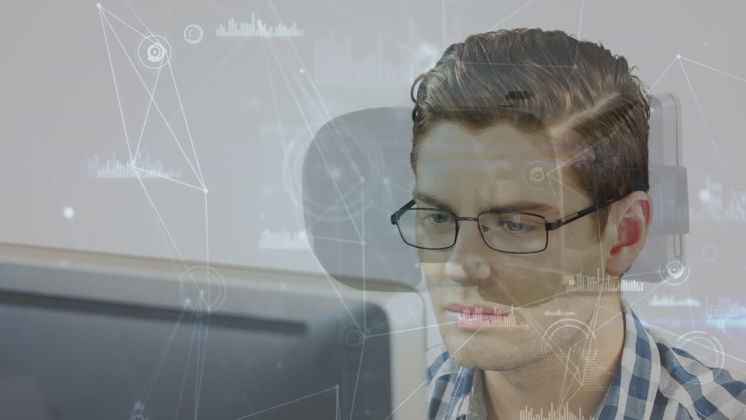 Caucasian man in glasses engages in data analysis on a computer in a modern office environment. Overlaid network graphics represent his interaction with digital networks. This video is ideal for illustrating concepts of technology, data analysis, business innovation, and modern office work environments. It suits articles on tech industries, corporate training, and future trends in data processing.