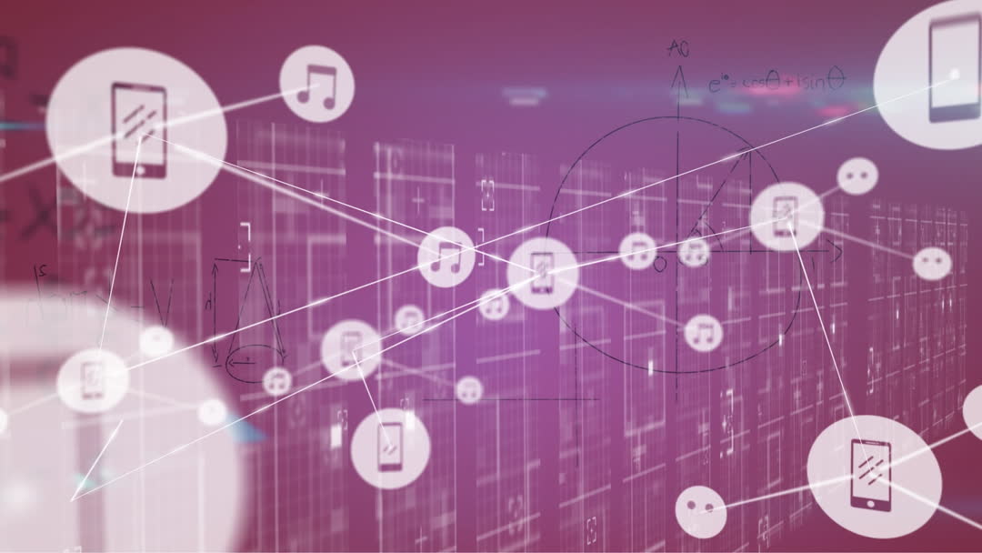 Technology background featuring a digital network overlay. Icons of smartphones and digital music notes interconnected against an abstract backdrop. Perfect for illustrating concepts related to digital communication, global networks, or technological innovation. Could be used in presentations, websites dedicated to digital transformation or for creating related graphics in technology articles.
