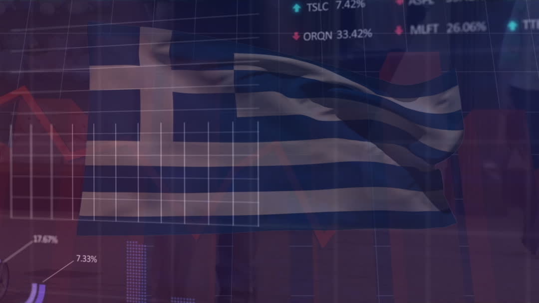 Dynamic digital scene featuring Greece national flag juxtaposed with modern technological data interfaces and analytics visuals. Ideal for presentations on Greek economy, tech conferences, business reports trying to visualize economic trends, or showcasing data-driven growth in Greece.