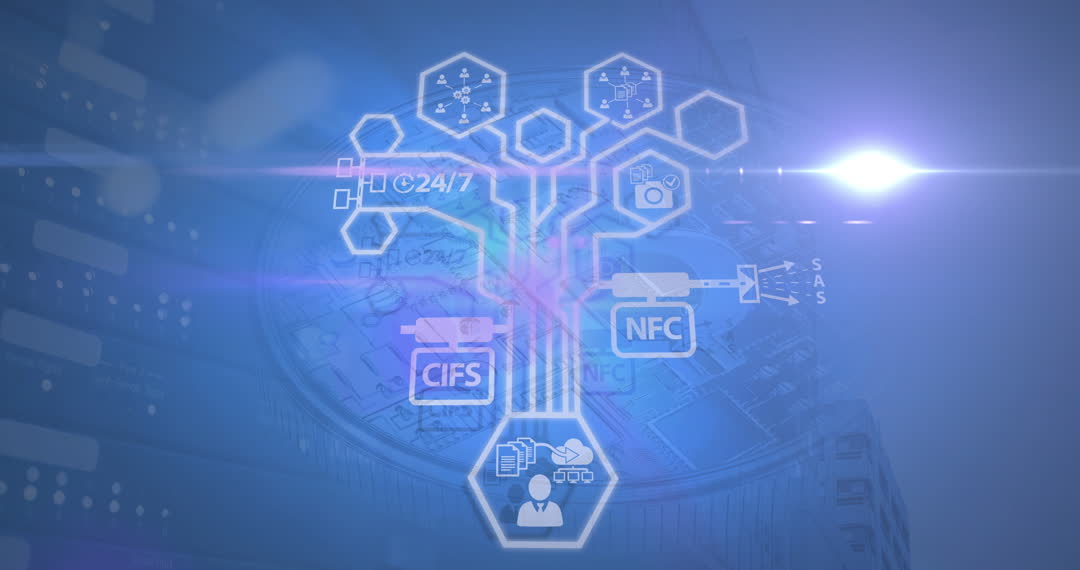 Hexagonal icons representing technology and networking concepts appear over a blue background featuring a digital-like representation of Bitcoin and light effects. This visual can be used in presentations or alluding to modern technology in articles discussing digital finances, blockchain, cybersecurity, or innovative networking solutions.