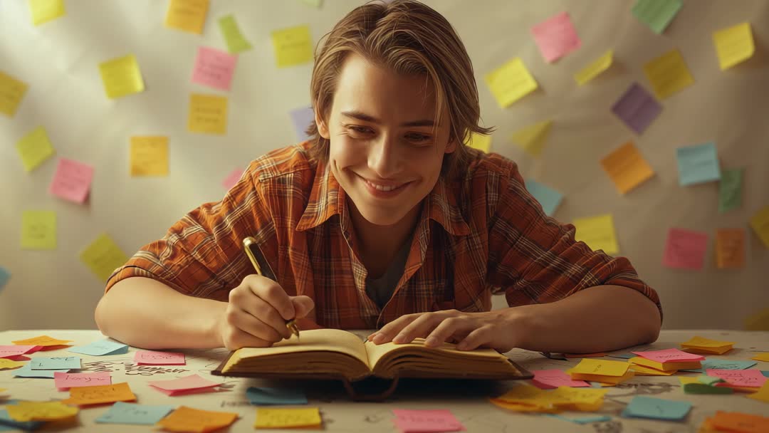 AI Generated Image. A young writer in a plaid shirt immerses in the art of writing, surrounded by colorful sticky notes symbolizing ideas and thoughts. Pencil in hand, the teen expresses joy and concentration while crafting new content. This scene captures the essence of creativity, learning, and youthful energy, exemplifying dedication to writing projects. Suitable for campaigns on education, creative workshops, inspirational writings, and youth engagement in hobbies and pursuits of passion.