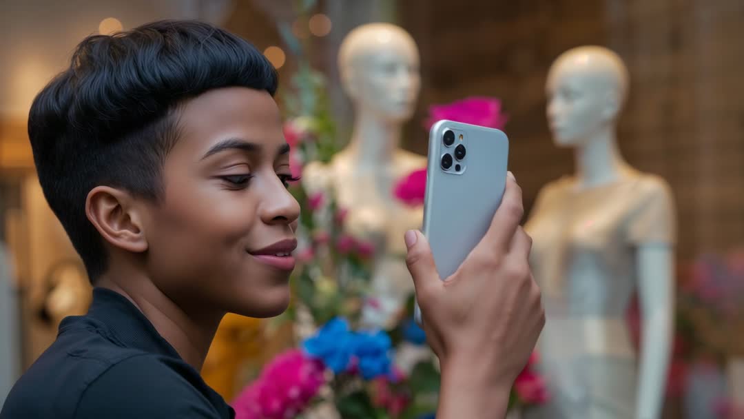 AI Generated Image. Close-up video clip showing teen holding smartphone, smiling and checking notification while standing next to boutique window with mannequins and colorful floral display. Background featuring soft bokeh lights and shallow depth of field, creating warm urban retail atmosphere. Footage fitting for hero clips, cutaways, and B-roll for youth lifestyle, mobile app, social media, or retail campaigns. Use for app promo, online shopping tutorials, blog headers, banner ads, in-store digital signage, and ecommerce landing pages. Recommend horizontal crop for web hero, vertical crop for stories and reels, gentle color grading to enhance warm tones, and adding caption overlay for social posts.