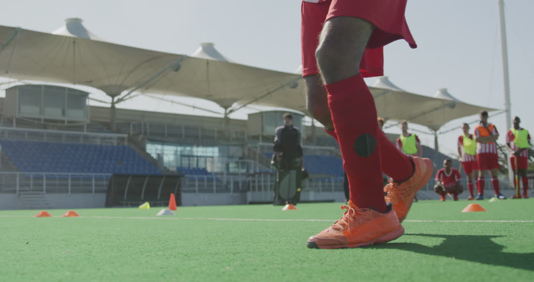 Teen sports athlete practicing field hockey on a sunny pitch, showcasing footwear technique and agility. Players and coach visible in background. Ideal for illustrating youth sports intensity, teamwork benefits, or promotional material for sports gear and youth programs.