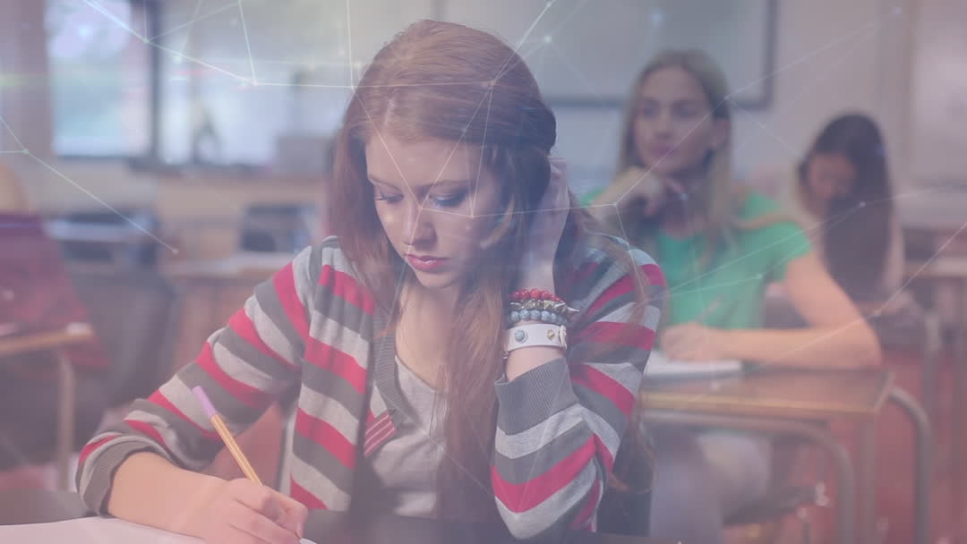 Teen Girl Studying Amidst Digital Network Overlay in Classroom Video