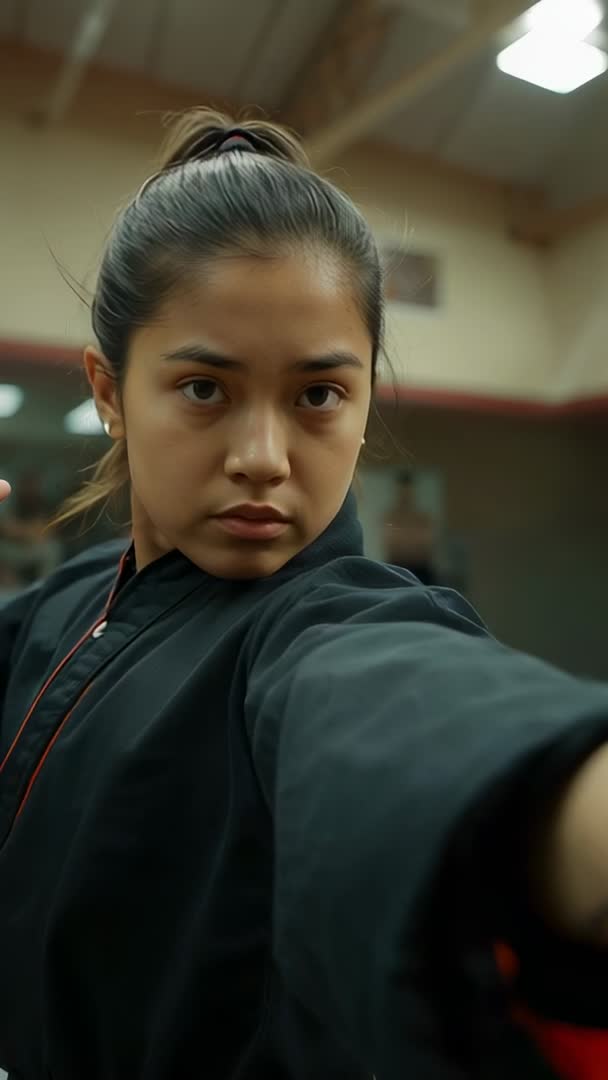 AI Generated Video. Clip showing teen martial arts student practicing focused arm extension drill in dojo. Vertical mobile-friendly framing emphasizing facial focus and forward arm movement. Use for social media reels, training tutorials, dojo promotion, youth sports programs, self-defense courses, fitness campaigns, and instructional content. Editing suggestions include adding slow-motion segments highlighting technique, overlaying instructional text or diagrams naming movement, adding motivating music and voiceover coaching cues, and using color grade that enhances warm indoor tones. Shot works well as opener for class promo, tutorial breakdown, athlete profile, or motivational short. Shot details: close-up medium framing, black gi, indoor gym lighting, natural motion and intensity.