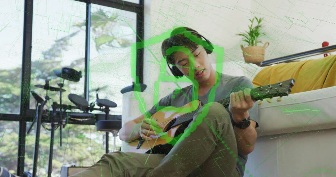 Teenage boy sitting on floor adjusting and strumming guitar while wearing headphones. Animated musical notes enrich scene, adding a dynamic visual element to music practice. Ideal video content for promoting music education, showcasing relaxation through creativity, creating inspiring teaching materials and illustrating tranquil home music setups.