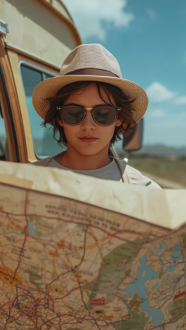 AI Generated Video. Showing male teen reading map beside retro camper van after stopping on sunlit country road. Wearing straw hat and sunglasses, scanning map while choosing route. Background featuring open sky and distant hills, conveying freedom and exploration. Warm vintage color grading evoking nostalgia and summer travel mood. Suiting vertical video ads, travel vlogs, social media reels, family travel promotions, navigation and map app campaigns. Suggestions for use: use as intro clip for road trip series, overlay text for route planning tips, background footage for camper rental websites, hero shot for adventure travel campaigns, vertical thumbnail for mobile travel playlists.