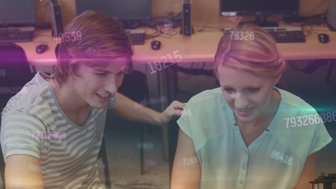 This visual captures teenage students engrossed in a computer-based learning environment, emphasized by an animation of numbers swirling above them. It illustrates the integration of technology into modern education, making it ideal for use in educational materials, discussions on digital learning advancements, or content highlighting student teamwork and collaboration.