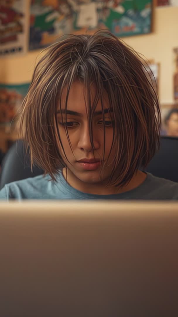 AI Generated Image. Vertical clip showing student settling into chair and scanning laptop screen, studying and focusing on task. Close-up framing highlighting focused expression and casual bob haircut, creating intimate learning moment. Warm natural lighting and blurred background adding cozy atmosphere ideal for online education projects. Working well for promoting online courses, e-learning platforms, study tips reels, remote learning campaigns, social vertical ads and mobile app tutorials. Use in website hero loops, course landing pages, Instagram and TikTok reels, education blog headers, or as B-roll for documentary and corporate training videos. Color palette working well with warm brand themes; silent playback compatible with caption overlays and animated text.
