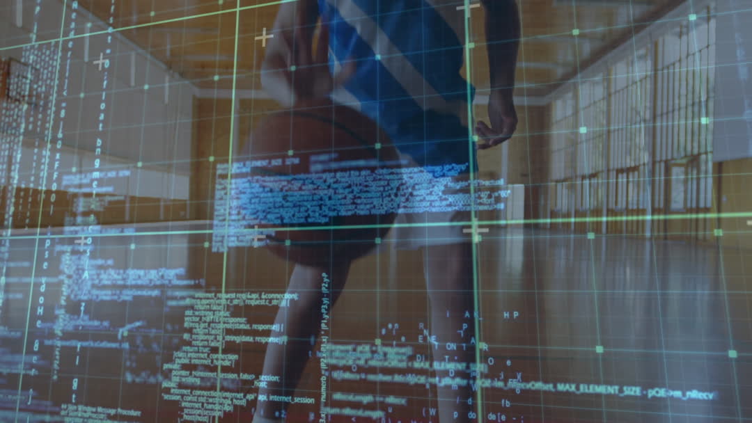 The scene features a teenage boy enthusiastically playing basketball with a technological overlay of digital data and coding on the video. This abstract combination symbolizes the intersection of sports and technology, perfect for illustrating the modernization of athletic training with tech advancements. Ideal for use in articles or promotions related to tech innovations in training, youth in sports, or the blend of athletics and data science.
