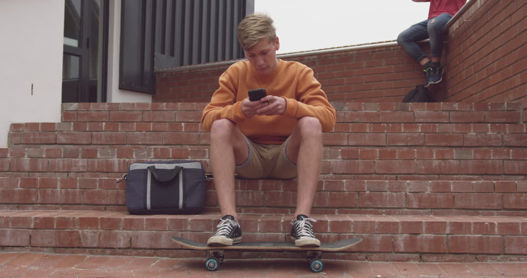 A Caucasian teenage boy is sitting on brick steps, absorbed in his smartphone, with a skateboard at his feet and a bag beside him. This scene captures everyday high school life and modern technology use among youth. Perfect for illustrating topics related to youth culture, technology, education, or urban life.
