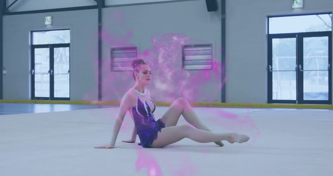 Described is a teenage skater in a sports hall initiating a floor routine with a mystical purple mist swirling around her. She wears a sequined athletic outfit, showcasing her focus and commitment to her sport. This can be a perfect choice to represent the themes of magical performance, dedication in young athletes or integrated modern sports aesthetics in dynamic settings. Useful for promotion of sports training programs, youth engagement in creative sports, or advertising thematic events merging sports with contemporary art.