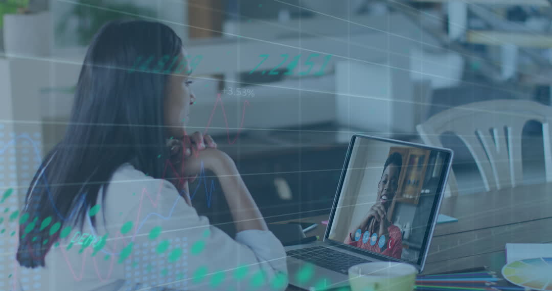 Depicts a biracial woman engaged in a video call on a laptop, with financial graphs superimposed. Conceptual markers of business communication in a digital era, emphasizing connectivity and data analytics. Useful for illustrating modern work environments, remote communication, or virtual meetings in finance or technology sectors.
