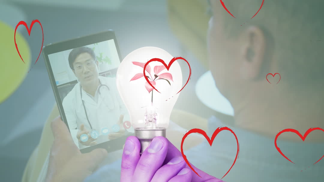 Depiction of a person engaging in a virtual doctor consultation holding a glowing light bulb, symbolizing innovation and bright ideas in medicine. Hearts surround the scene, highlighting compassion and a caring approach. Ideal for illustrating modern healthcare solutions or articles discussing advancements in telecommunication in medical fields.