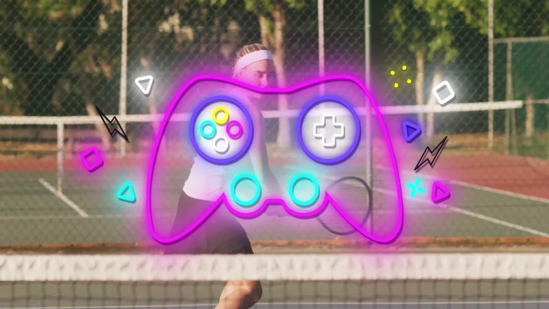 Tennis player striking ball on court with vibrant video game controller animation overlay. Illustrates merging world of physical sports and digital gaming, suggesting world of eSports and technology's influence in athletics. Suitable for content focusing on interactive sports, entertainment marketing, or tech developments in interactive gaming.