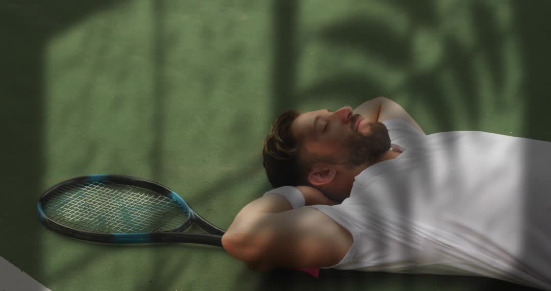 Tennis player lying on court appearing relaxed, holding racket beside him while digital data bars emphasize athlete’s focus on performance tracking and sports analytics. Ideal for featuring advancements in sports tracking technology, portraying athlete's rest time, or marketing sportswear with high-performance and modern elements.