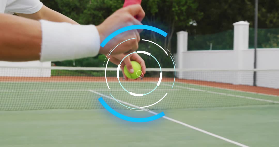 Two tennis players are practicing their serve on an outdoor court, featuring a digital graphic overlay that highlights the ball's trajectory and grip technique. This video is ideal for illustrating sports technology, tennis training tips, or competitive athletic settings. Perfect for use in sports marketing materials, coaching manuals, or athletic technology promotions.