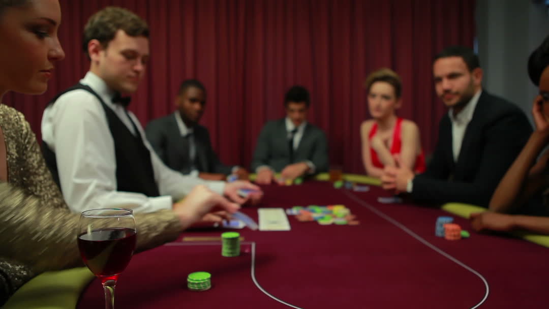 Tense Poker Game in Luxurious Casino Setting with Red Curtains Video