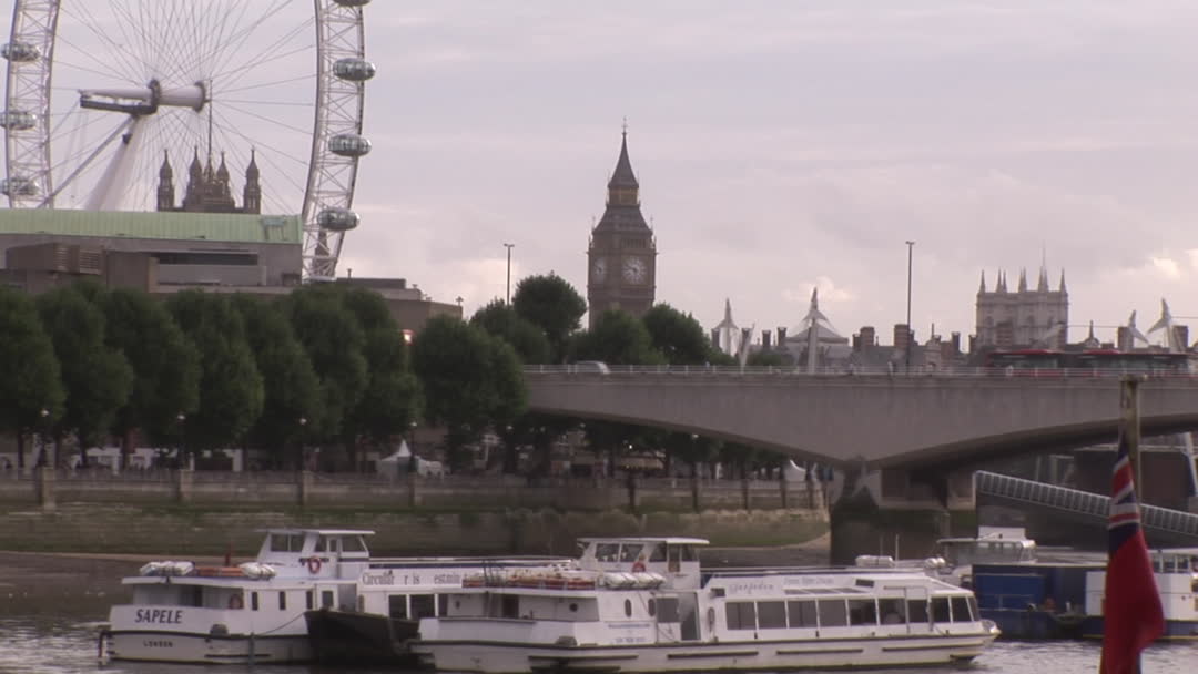 Thames River View with Iconic London Landmarks on Overcast Day Video