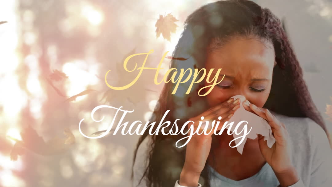 A festive animation conveys Happy Thanksgiving surrounded by gently falling autumn leaves. An African American woman is seen blowing her nose, offering a relatable touch for seasonal greetings during the colder months when colds or allergies may be prevalent. This animated visual can be used for digital cards, Thanksgiving promotions, social media posts promoting festive content, or holiday-themed advertisements.
