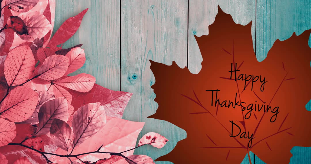 Colorful autumn leaves complement Thanksgiving message on vibrant background. Suitable for festive greetings, social media posts, holiday invitations, and seasonal promotions.