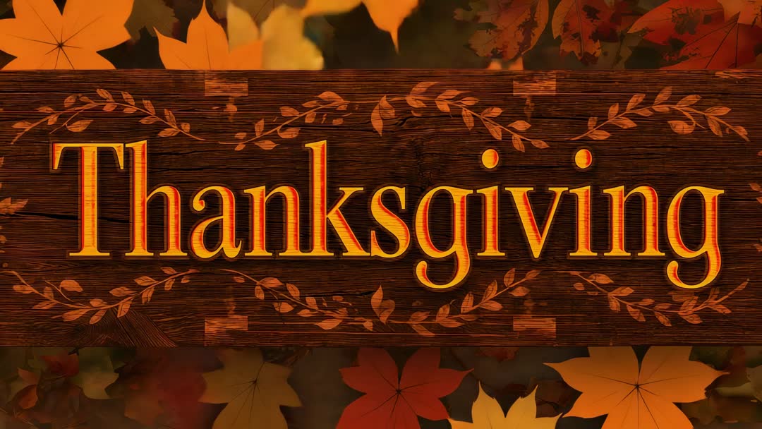 - Thanksgiving Wood Sign Animation with Drifting Autumn Leaves and Engraved Typography