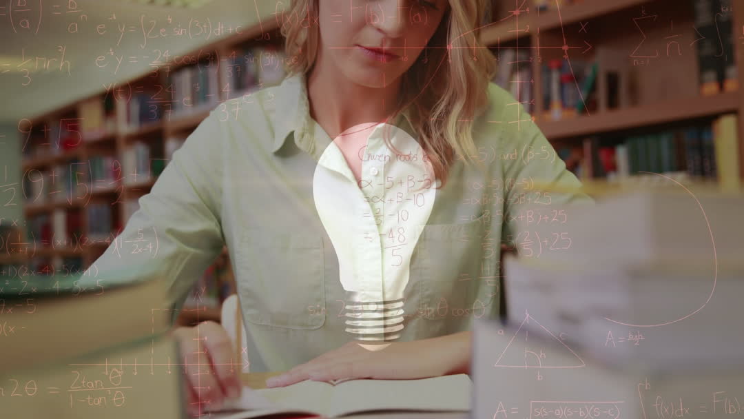 An intriguing scene featuring a person surrounded by math equations while seated in a library, with an illuminating light bulb motif that suggests inspiration and insight. Ideal for illustrating creativity, educational success, cognitive processes, innovative thinking, and study techniques.