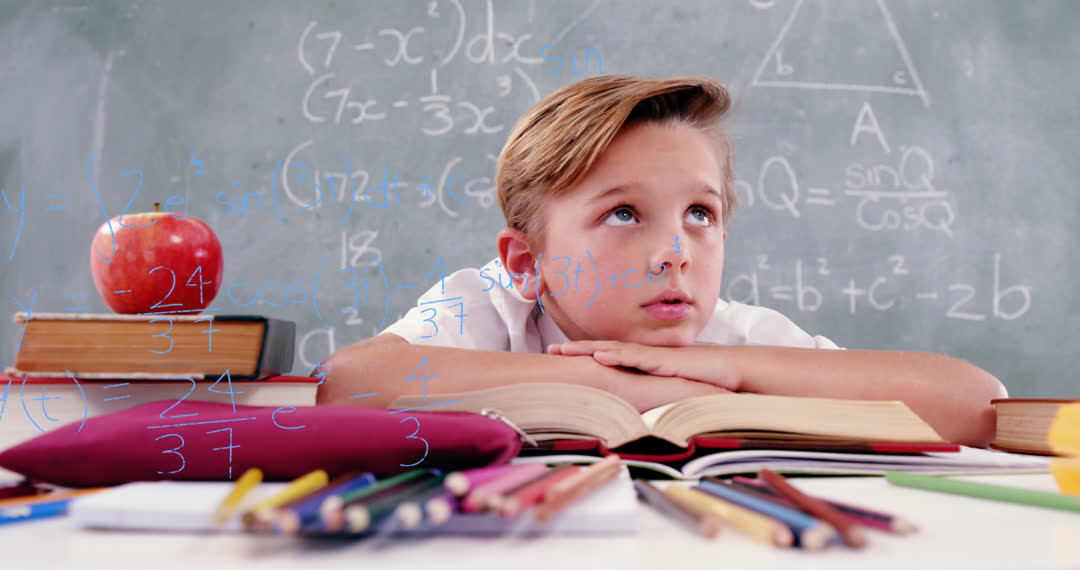 A young caucasian boy is in a classroom, surrounded by open books and colorful pencils on his desk. Mathematical equations and formulas are overlayed on the scene, indicating learning and exploration. This video is useful for educational materials, school-oriented websites, or articles discussing the importance of focusing on studies and understanding math concepts.