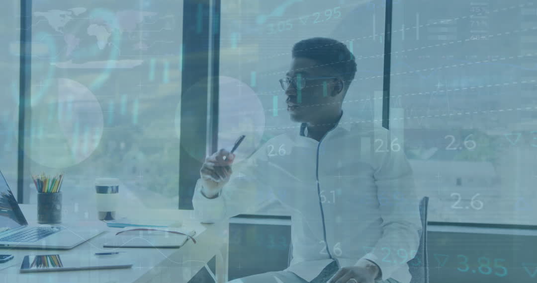 African American businessman is contemplating new data trends displayed on a transparent layer. The video conveys concepts of modern business analytics and the growing impact of digital technology on corporate decision-making. Suitable for illustrating articles on data analysis, technology in business, or financial planning.