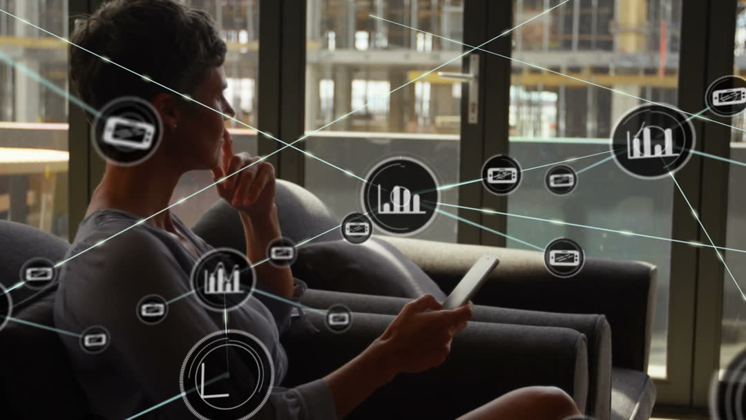 Caucasian woman sitting with smartphone overlayed with digital network icons, suggesting connectivity and global communication. Use for topics on digital transformation, modern technology, or connected living.