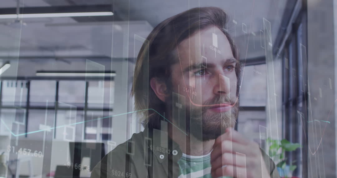 A bearded man is thoughtfully analyzing digital financial statistics overlaid on a window in a modern office. Perfect for use in projects focusing on financial analysis, business strategy, or technology impacts in corporate settings.