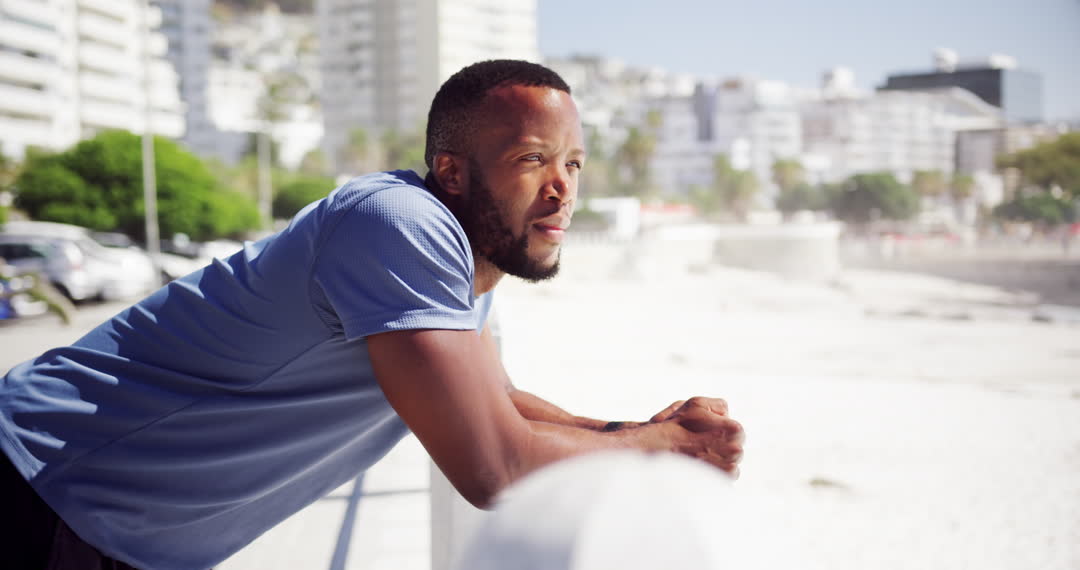 - Thoughtful Man Overlooking Beach in Sunny Urban Setting