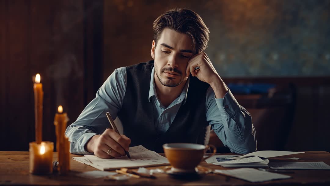 - Thoughtful Man Writing by Candlelight in Vintage Ambiance