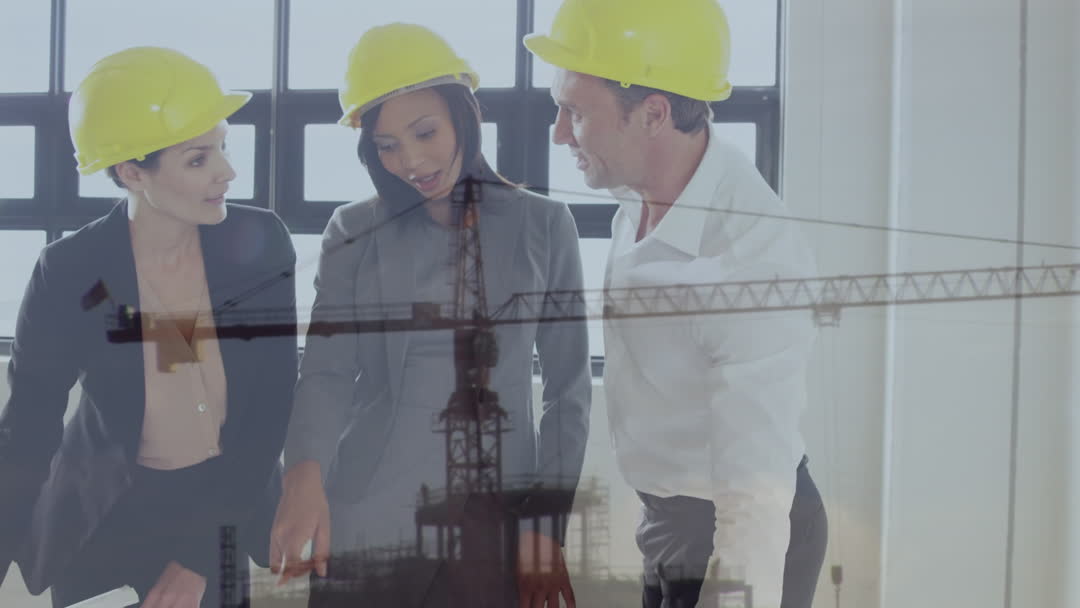 Group of engineers wearing yellow hard hats engaged in a discussion with a transparent overlay of construction videory, symbolizing innovation and technology in the architectural and engineering fields. Useful for illustrating concepts of teamwork, modern construction methods, and integration of technology in business.