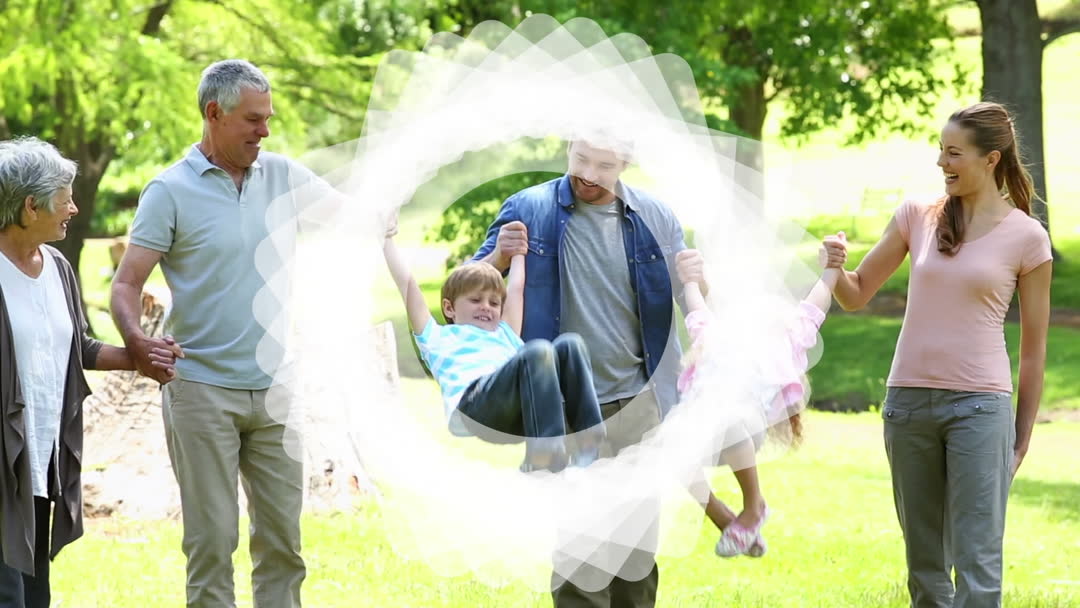 Happy multi-generational family playing together in a park under the sun. Animated graphic effect adds a dynamic element to the scene. Perfect for use in articles about family values, outdoor activities, promoting family time, or enhancing digital interfaces with a personal touch.