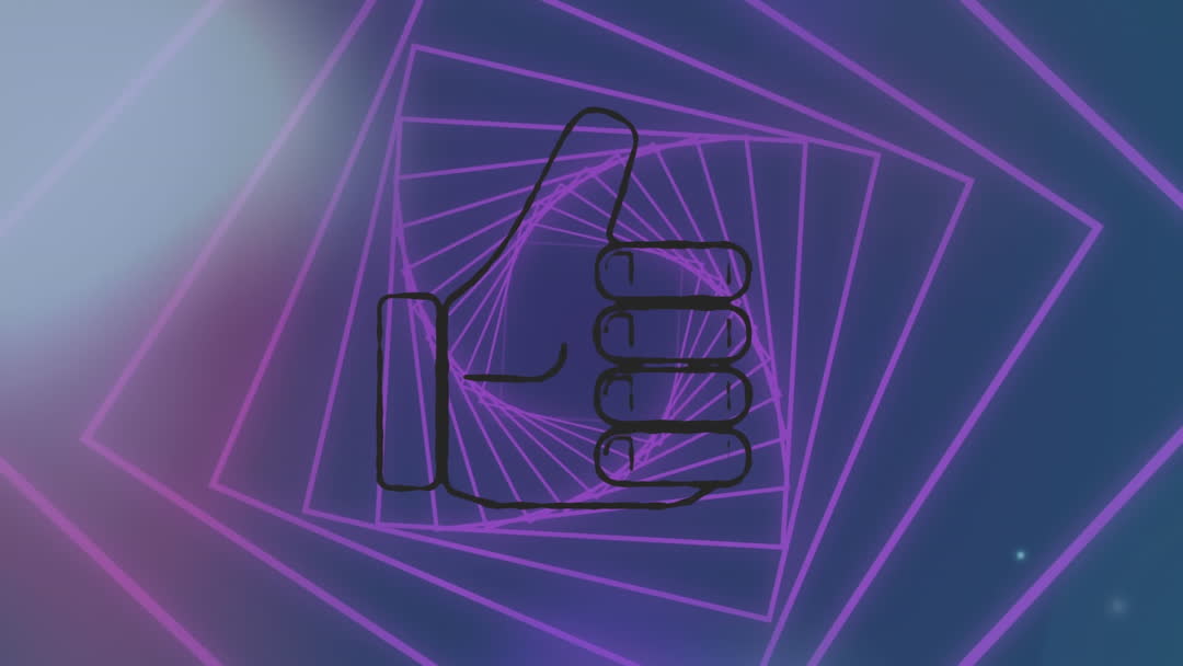 Bright and engaging visual showing thumbs up icon over a spiralling neon square. Ideal for illustrations emphasizing positive feedback or affirmations across social media channels and campaign materials involving motivational concepts or tech discussions.