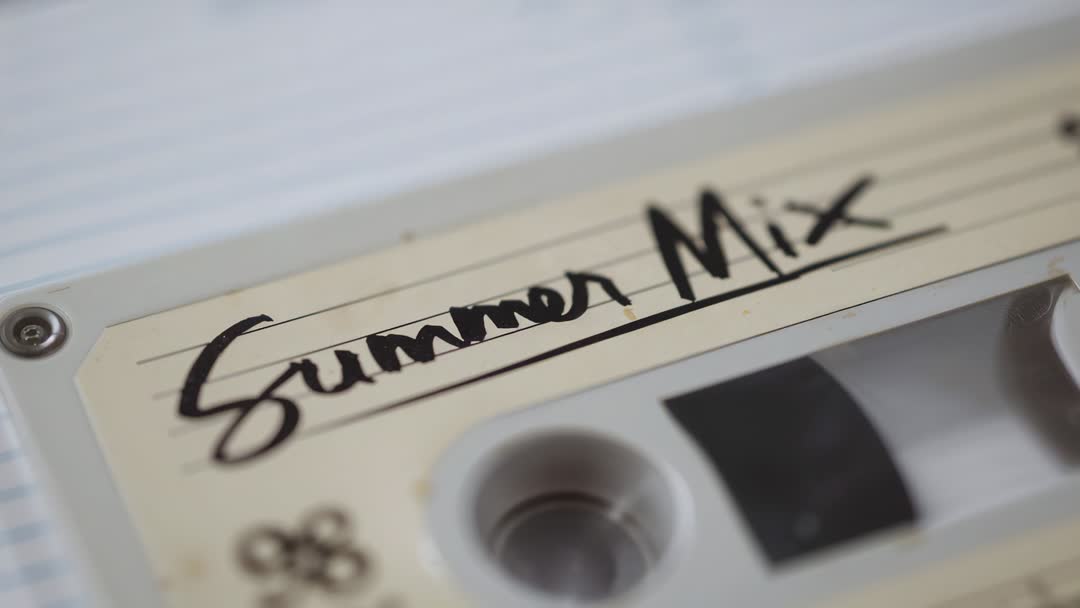 AI Generated Image. Short cinematic clip showing tightening focus on cassette with handwritten Summer Mix label while tape spools sit in shallow depth of field. Macro framing highlighting textured paper label, ink strokes, and plastic reel detail, evoking retro analog music nostalgia. Ideal for music playlist promos, social media reels, YouTube thumbnail clips, blog headers about mixtape culture, and advertising for vintage audio gear or record stores. Useful as background footage for podcast intros, motion graphics, and slide transitions where text overlay or logo placement is needed. Neutral color palette with warm ink contrast allowing easy color grading and branding.