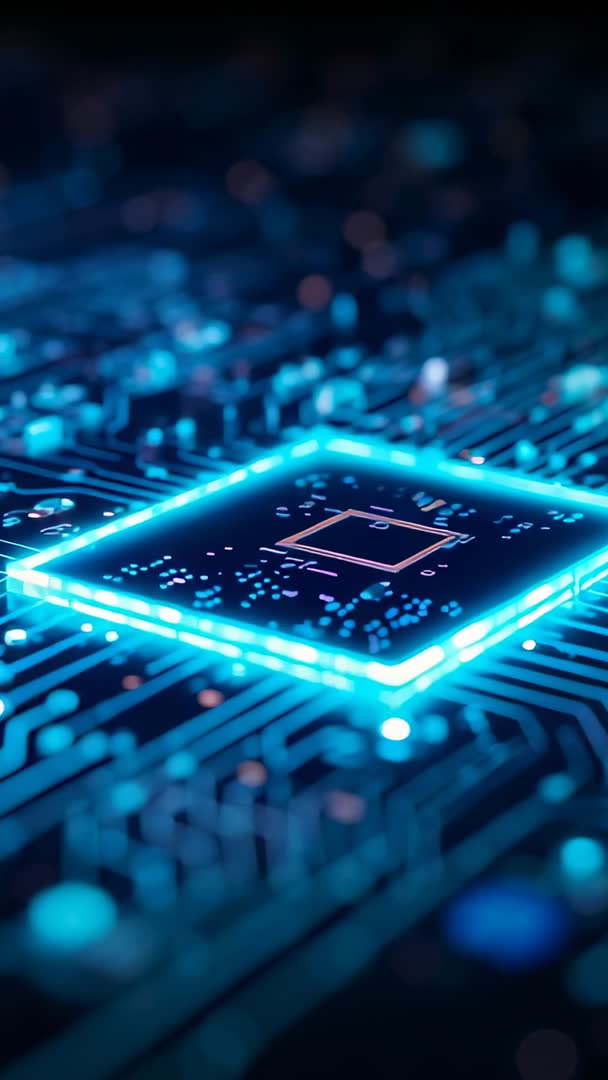 AI Generated Image. Showing closeup tilting and zooming over neon blue microchip and PCB traces with cinematic shallow depth of field. Emphasizing glowing circuitry, solder pads, and microprocessor outline for futuristic tech mood. Capturing high tech lab atmosphere with cool blue lighting and dynamic bokeh highlights. Ideal for tech product promos, AI and semiconductor explainer videos, cybersecurity intros, motherboard tutorials, and startup pitch decks. Serving well as background for title overlays, lower thirds, and animated infographics. Providing 9:16 vertical framing for mobile-first campaigns and social media stories. Including suggestions for color grading to boost neon contrast and for adding animated HUD graphics or data overlays to enhance storytelling.
