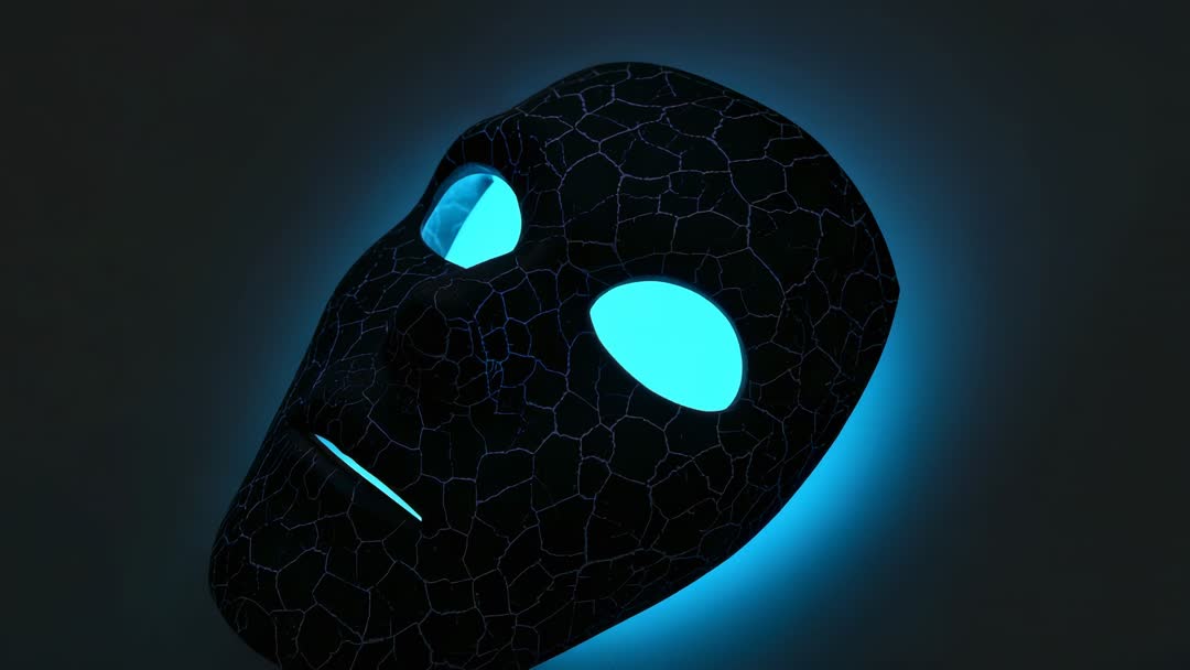 - Tilting Black Cracked Mosaic Mask Emitting Cyan Glow from Eyes and Mouth with Backlit Halo