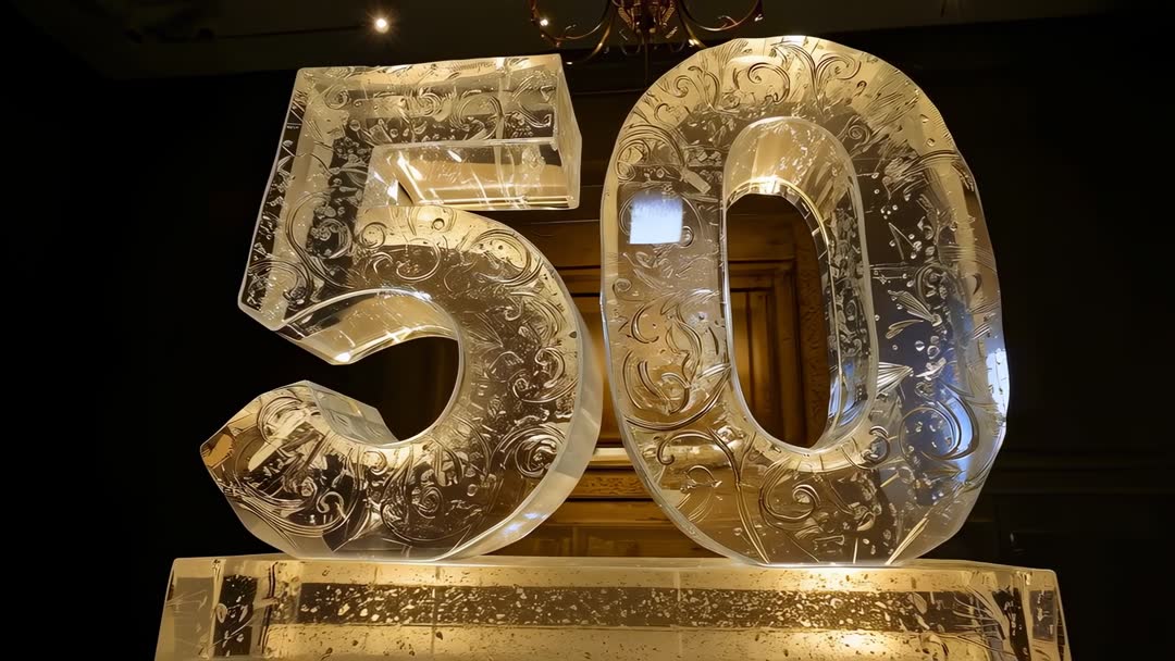 AI Generated Image. Video clip showing tilting camera revealing large 50 ice sculpture centerpiece in grand ballroom under chandelier lighting, ornate carving catching golden reflections and frosted details. Scene conveying milestone celebration, elegance, luxury atmosphere, and formal event styling. Working well for anniversary and milestone promotions, event planning reels, luxury brand campaigns, wedding and gala highlight reels, and hospitality marketing. Suiting hero video, social media short, website header, event recap montage, invitation teaser, and broadcast opener. Allowing close-up crop for detail, slow reveal or dolly zoom edits, and color grading to enhance warm highlights or cool crystal tones. Providing visual focus for copy about celebration, milestone achievement, premium service, and upscale event design.