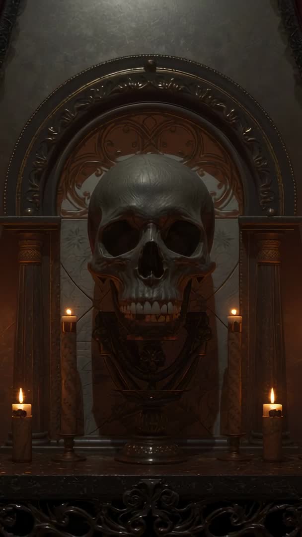 AI Generated Image. Tilting camera revealing oversized metallic skull mounted on ornate altar framed by carved arch and marble columns. Low-key lighting casting warm candlelight glow and deep shadows, candles flickering along altar edges. Rich bronze and marble textures showing intricate baroque carving and aged patina. Slow vertical movement creating suspenseful reveal and cinematic mood. Ideal for horror trailers, gothic game intros, occult ritual sequences, Halloween social media ads, and atmospheric title cards. Suited for vertical 9:16 delivery on mobile platforms, supporting slow-motion looping and dramatic color grading. Pairing with ambient choir drone or subtle percussion for immersive effect. Using for promotional reels, background visual for podcasts, book trailer bumpers, event posters, and interior design mockups for themed venues.
